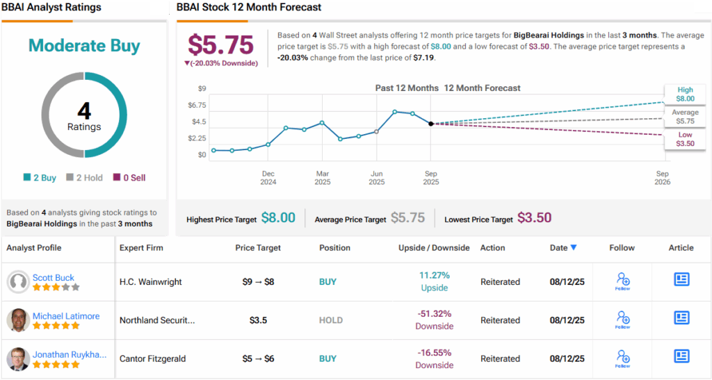 The lightly covered stock hasn’t exactly set Wall Street on fire. With 2 Buys and 1 Hold, BBAI carries a Moderate Buy consensus rating. Its 12-month average price target of $5.75 would translate into losses approaching 20%. (See BBAI stock forecast)