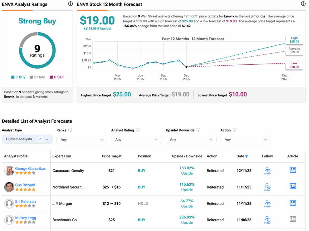 Turning to Wall Street, analysts have a Strong Buy consensus rating on ENVX stock based on seven Buys and two Holds assigned in the past three months. Furthermore, Enovix’s average stock price target of $19.00 per share implies 156.06% upside potential.