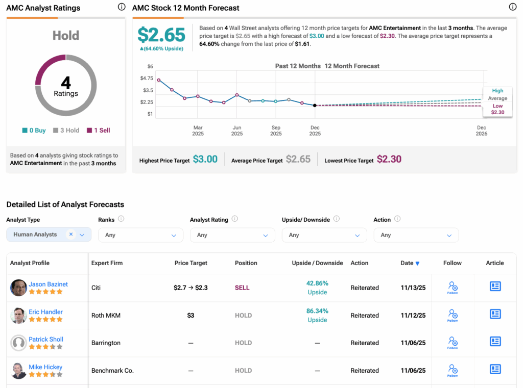 Turning to Wall Street, analysts have a Hold consensus rating on AMC stock based on three Holds and one Sell assigned in the past three months. However, AMC’s average stock price target of $2.65 per share implies 65% upside potential.