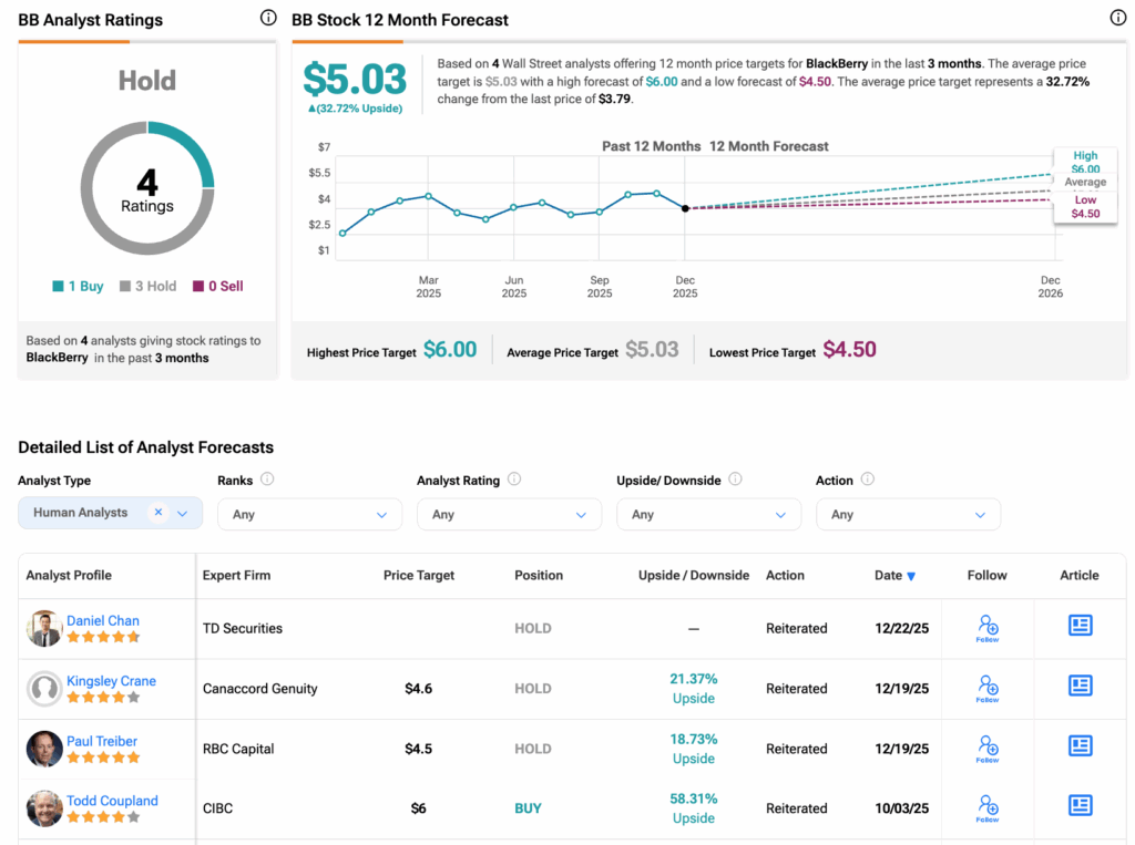 Looking ahead, analysts have a Hold consensus rating on BB stock based on three Holds and one Buy assigned in the past three months. However, BlackBerry’s average stock price target of $5.03 per share implies 33% upside potential.