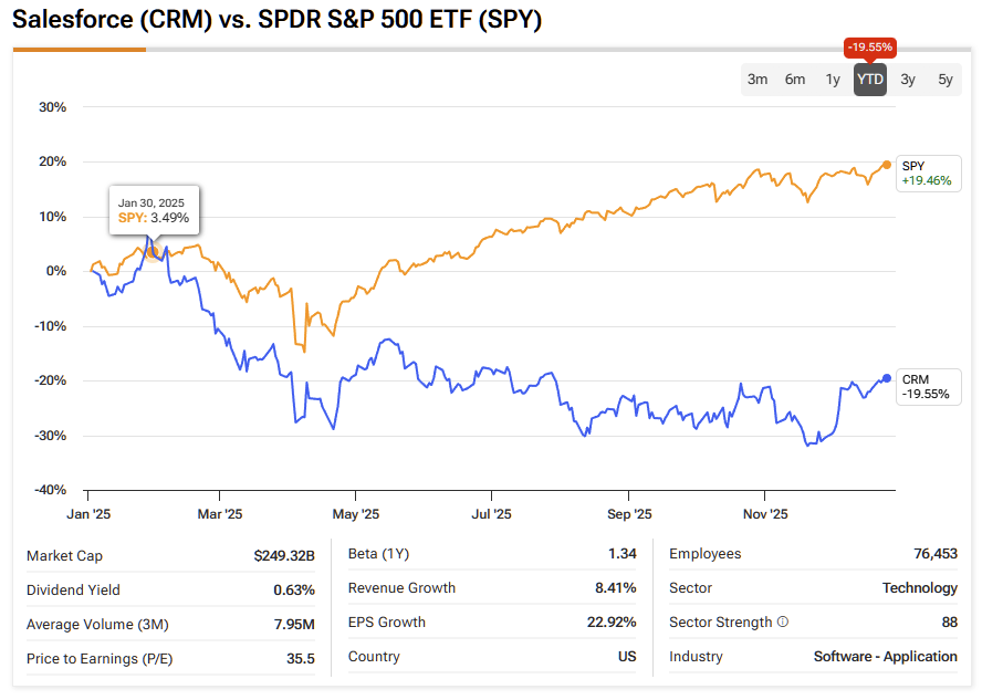 Customer relationship management software leader Salesforce (CRM) is stumbling toward the end of 2025, down roughly 20% and sharply decoupling from the S&P 500 (SPX) since May, which has moved in the opposite direction by nearly the same magnitude. In my view, this weakness reflects investor uncertainty around Salesforce’s transition to an AI-first operating model rather than any fundamental deterioration in the business. I see the recent drawdown as a compelling entry opportunity.
