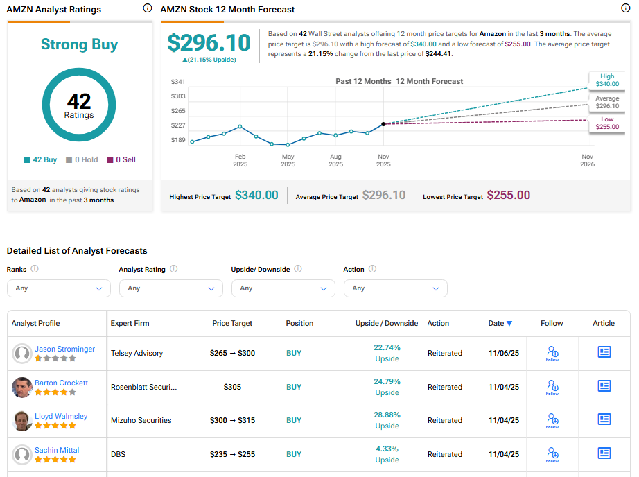 Recently, Mizuho analyst Lloyd Walmsley raised his price target on Amazon stock to $315 from $300 and kept a Buy rating. The 5-star analyst said his higher target reflects stronger confidence after Amazon’s solid Q3 results, upbeat management comments, and the new OpenAI partnership.