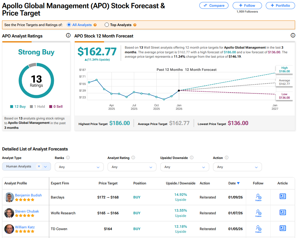 On TipRanks, APO has a Strong Buy consensus based on 12 Buy and 1 Hold ratings. Its highest price target is $186. APO stock’s consensus price target is $162.77, implying an 11.34% upside.