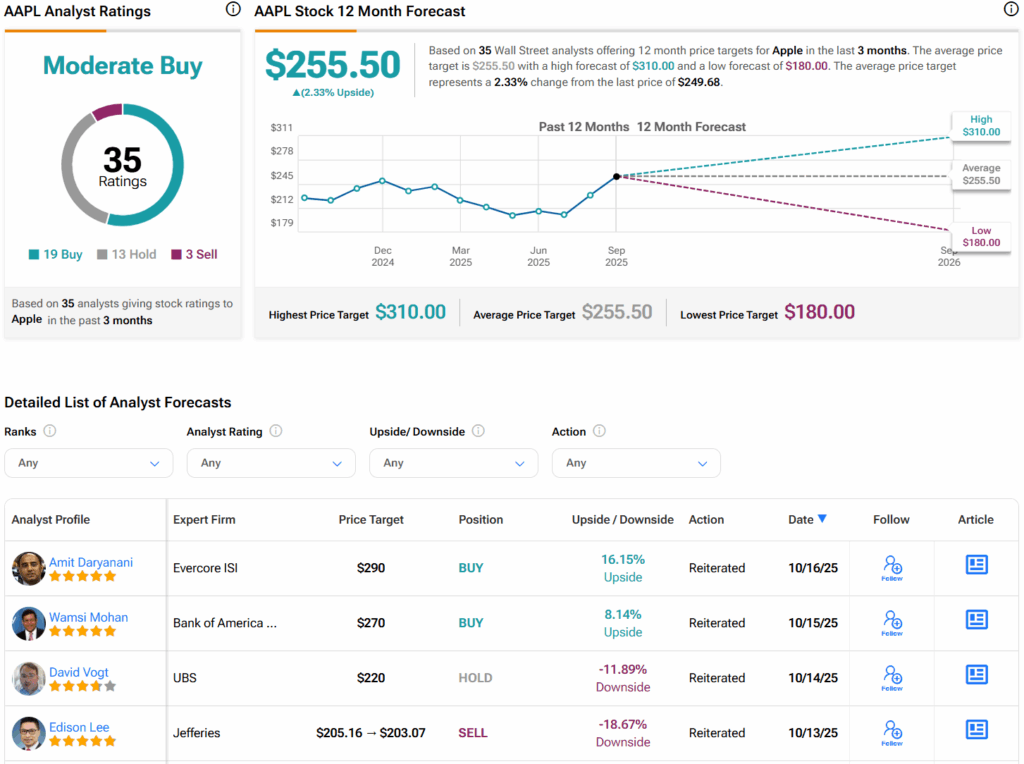 Turning to Wall Street, analysts have a Moderate Buy consensus rating on AAPL stock based on 19 Buys, 13 Holds, and three Sells assigned in the past three months, as indicated by the graphic below. Furthermore, the average AAPL price target of $255.50 per share implies 2.3% upside potential.