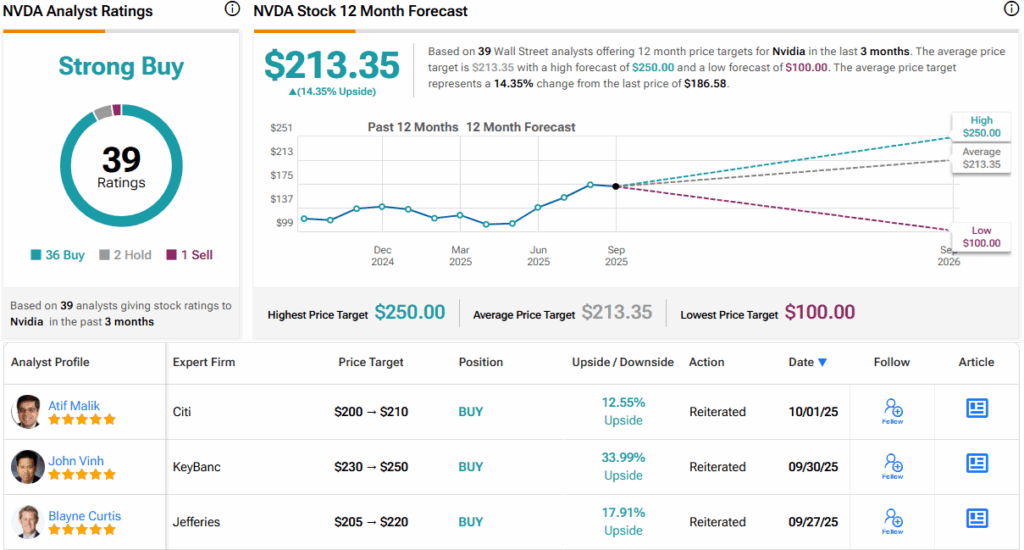 Turning now to the rest of the Street, where the Citi view gets the backing of 35 other analysts while an additional 2 Holds and 1 Sell can’t detract from a Strong Buy consensus rating. The forecast calls for 12-month returns of 14%, considering the average target clocks in at $213.35. (See Nvidia stock forecast)