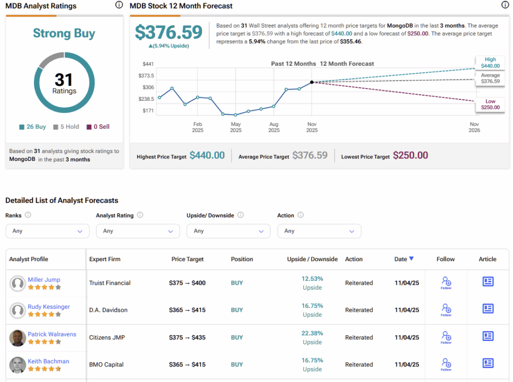 According to TipRanks, MongoDB carries a Strong Buy consensus rating, based on 31 analyst reviews. The breakdown includes 26 Buys, 5 Holds, and 0 Sells, obtained over the past three months. MDB’s average stock price target is $376.59, representing ~6% upside over the next 12 months.
