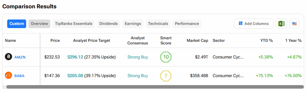 Both Alibaba and Amazon carry a Strong Buy rating and offer meaningful upside into 2026. Alibaba stands out on price-target upside, while Amazon scores higher on overall quality and momentum, reflected in its top Smart Score.