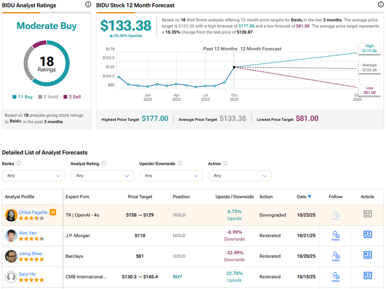 Currently, Wall Street has a Moderate Buy consensus rating on Baidu stock based on 11 Buys, five Holds, and two Sell recommendations. The average BIDU stock price target of $133.38 indicates 10.4% upside potential. Baidu stock has risen 43.4% year-to-date.