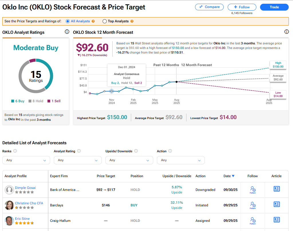The stock of Oklo has a consensus Moderate Buy rating among 15 Wall Street analysts. That rating is based on six Buy, eight Hold, and one Sell recommendations issued in the last three months. The average OKLO price target of $92.60 implies 16.21% downside from current levels.