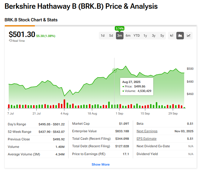 Only a few analysts currently offer a rating and price target on Berkshire Hathaway’s more affordable class B stock. So instead, we’ll look at the stock’s three-month performance. As one can see in the chart below, shares of BRK.B have risen 2.68% in the last 12 weeks.