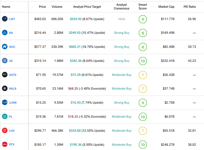 Using TipRanks’ Comparison Tool, we’ve assembled major American companies in the space sector. Some, like AST SpaceMobile (ASTS) and Rocket Lab USA (RKLB), are pure-play, while others, such as Boeing (BA) and RTX (RTX), operate a space division alongside their other operations.