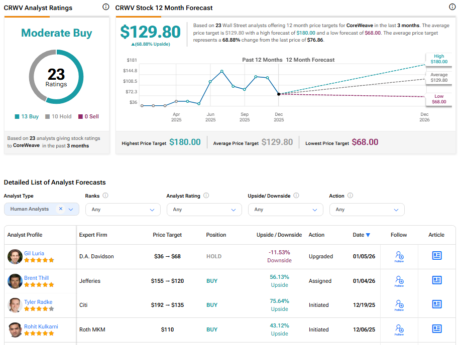 Overall, Wall Street has a Moderate Buy consensus rating on CoreWeave stock based on 13 Buys and 10 Holds. The average CRWV stock price target of $129.80 indicates 66% upside potential.