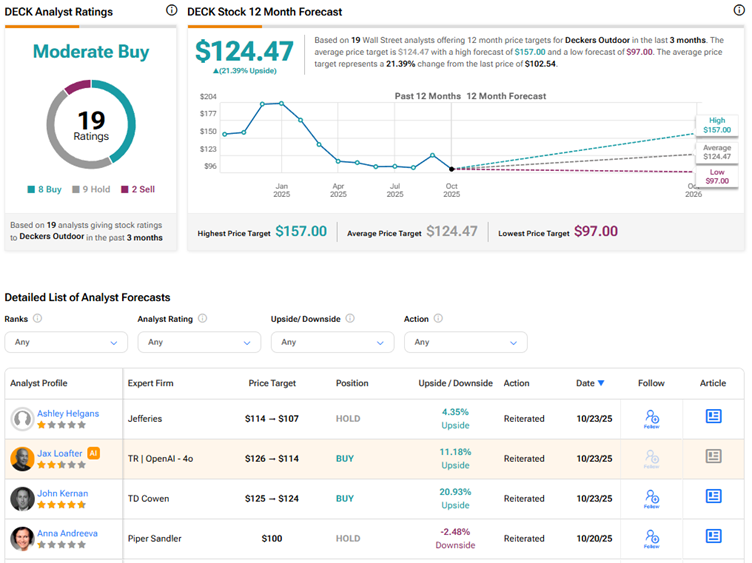 Currently, Wall Street has a Moderate Buy consensus rating on Deckers Outdoor stock based on eight Buys, nine Holds, and two Sell recommendations. The average DECK stock price target of $124.47 indicates 21.4% upside potential.