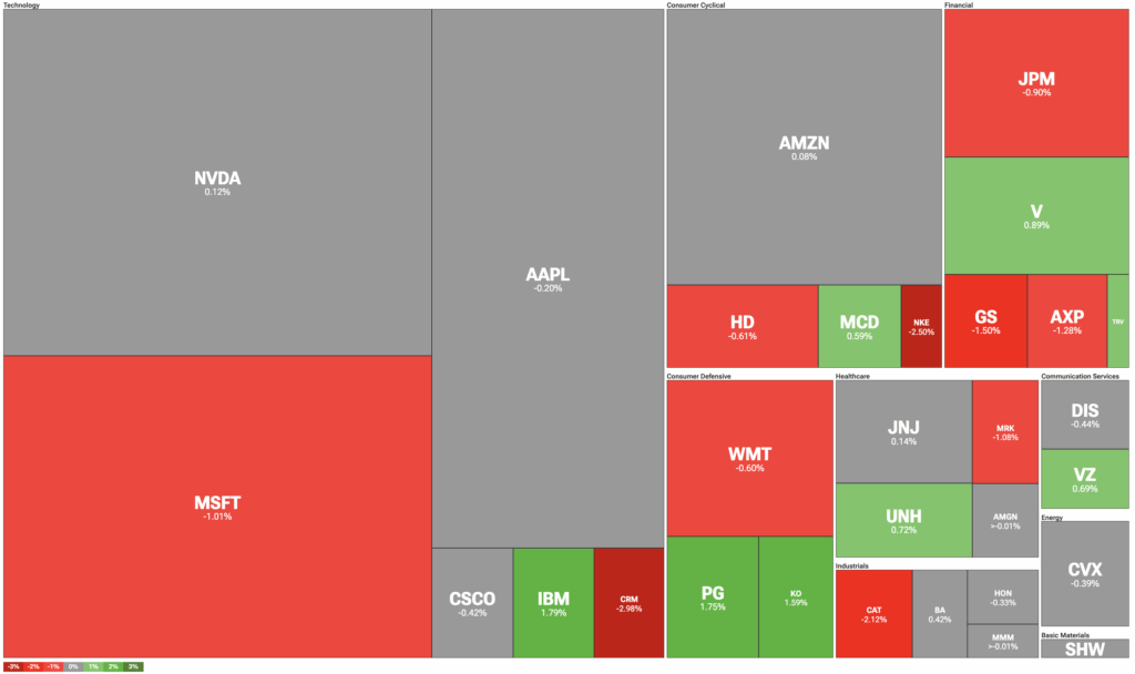 Let’s pivot to TipRanks’ Dow Jones Heatmap, which illustrates the stocks that have contributed to the index’s price action.