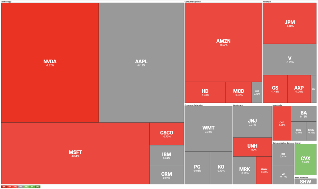 Let’s pivot to TipRanks’ Dow Jones Heatmap, which illustrates the stocks that have contributed to the index’s price action.