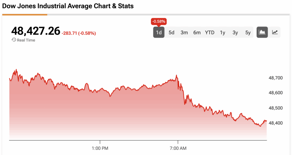 The Dow Jones is down by 0.58% at the time of writing.