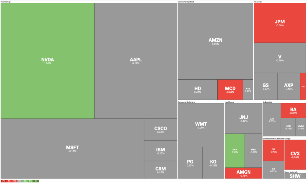 Let’s pivot to TipRanks’ Dow Jones Heatmap, which illustrates the stocks that have contributed to the index’s price action.
