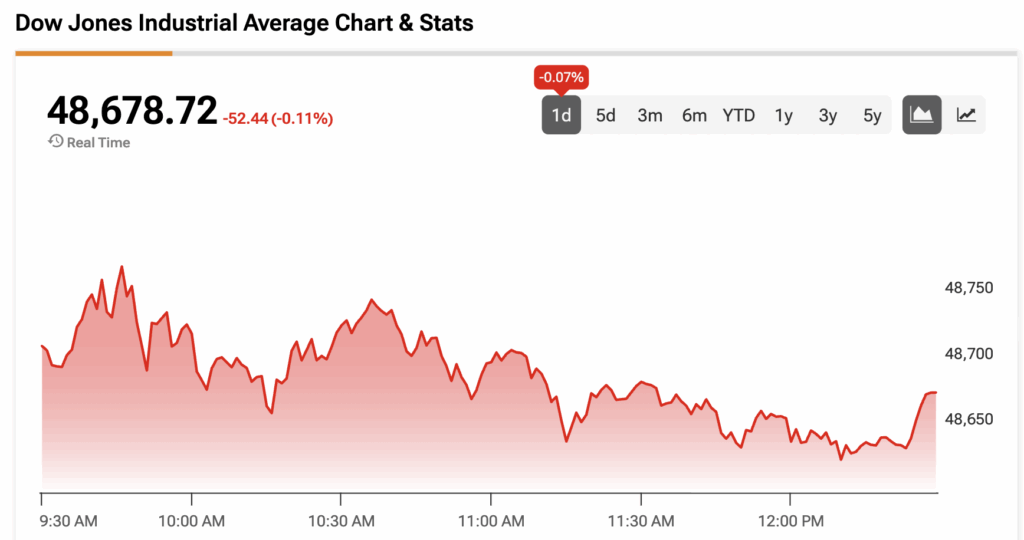 The Dow Jones (DJIA) is trading slightly lower ahead of the weekend with low volume after the Christmas holiday.