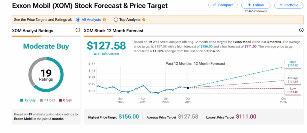 Across Wall Street, ExxonMobil’s shares currently have a Moderate Buy consensus rating, according to TipRanks data. This is based on 12 Buys and seven Holds issued by 19 analysts over the past three months.