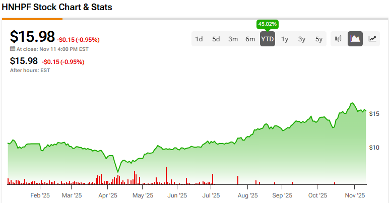 Meanwhile, HNHPF shares dropped by 0.95% on Tuesday to close at $15.98.