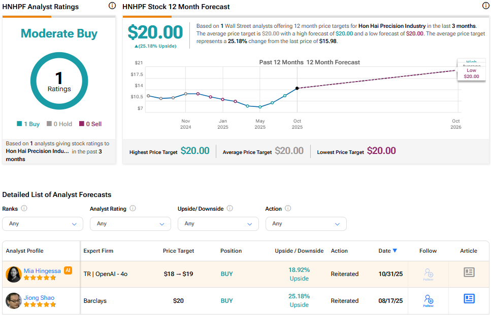 Foxconn is thinly followed by the Street’s analysts. Based on one rating, the stock boasts a Moderate Buy consensus. The average HNHPF stock price target is $20, implying a 25.18% upside from the current price.