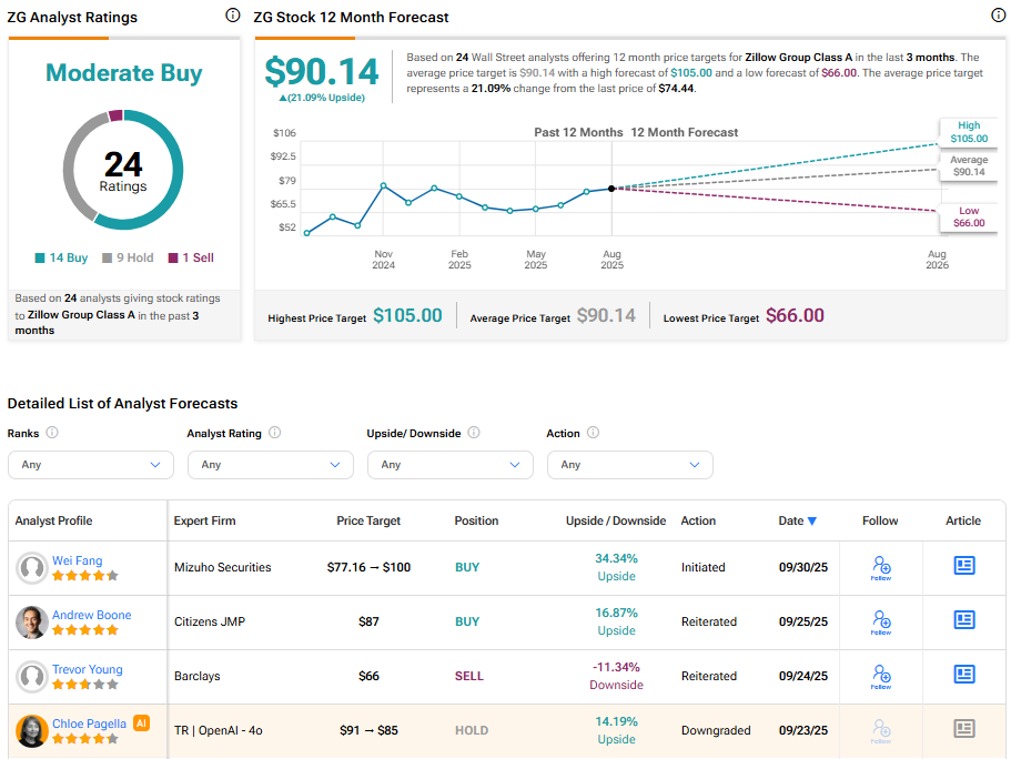 On TipRanks, ZG stock has received a Moderate Buy consensus rating, with 14 Buys, nine Holds, and one Sell assigned in the last three months. The average Zillow stock price target is $90.14, suggesting an upside potential of 21.09% from the current level.