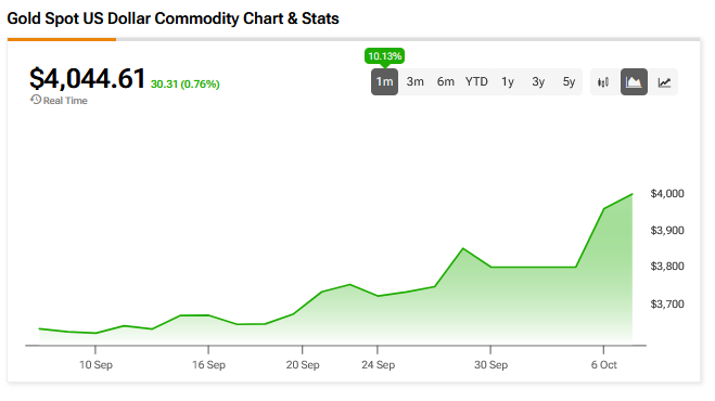 The spot gold price reached $4,044 an ounce in early trading. The price has continued to rise steadily this year, setting new record after new record – see below: