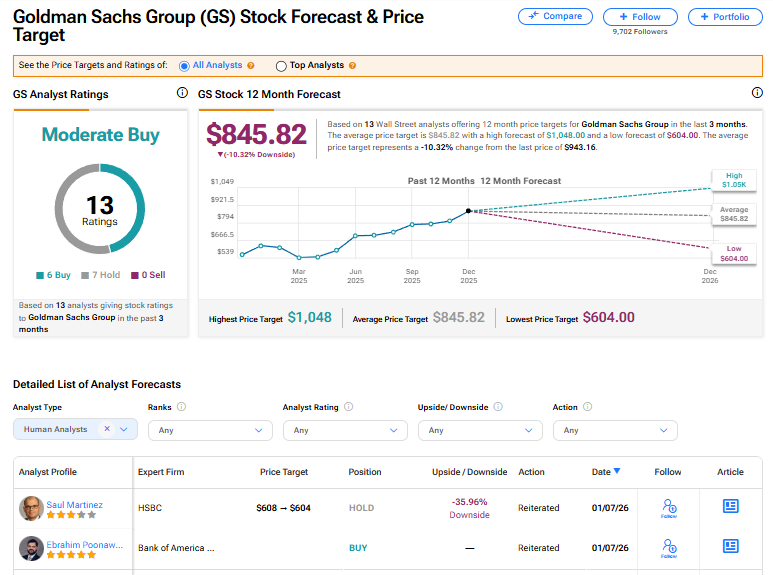 Goldman Sachs’ stock has a consensus Moderate Buy rating among 13 Wall Street analysts. That rating is based on six Buy and seven Hold recommendations issued in the last three months. The average GS price target of $845.82 implies 10.32% downside from current levels.