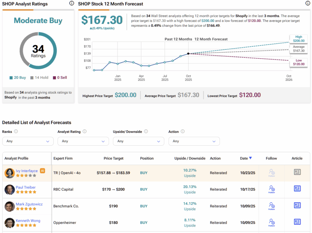 According to TipRanks, Shopify carries a Moderate Buy consensus rating among 34 analysts: 21 Buys, 14 Holds, and 0 Sells. The average stock price target stands at $167.30, implying less than 1% upside over the coming year.