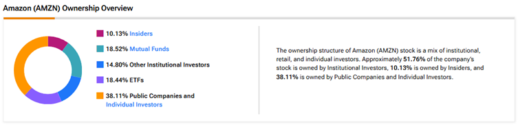 Now, according to TipRanks’ Ownership Tool, public companies and individual investors own 38.11% of Amazon. They are followed by mutual funds, exchange-traded funds (ETFs), other institutional investors, and insiders at 18.52%, 18.44%, 14.80%, and 10.13%, respectively.