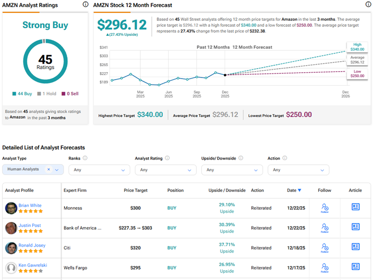 Overall, Wall Street has a Strong Buy consensus rating on Amazon stock based on 44 Buys versus one Hold recommendation. The average AMZN stock price target of $296.12 indicates 27.4% upside potential.