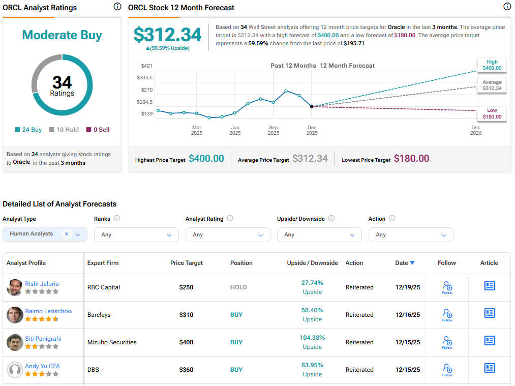 Overall, Wall Street has a Moderate Buy consensus rating on Oracle stock based on 24 Buys and 10 Hold recommendations. The average ORCL stock price target of $312.34 indicates about 60% upside potential. ORCL stock has risen 18% over the past year.
