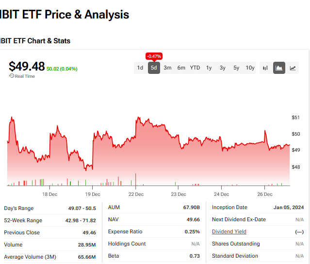 The iShares Bitcoin Trust ETF (IBIT) flattened out the day after Christmas. The IBIT is now down 0.47% over the last 5 days and off 6.77% in the year-to-date.