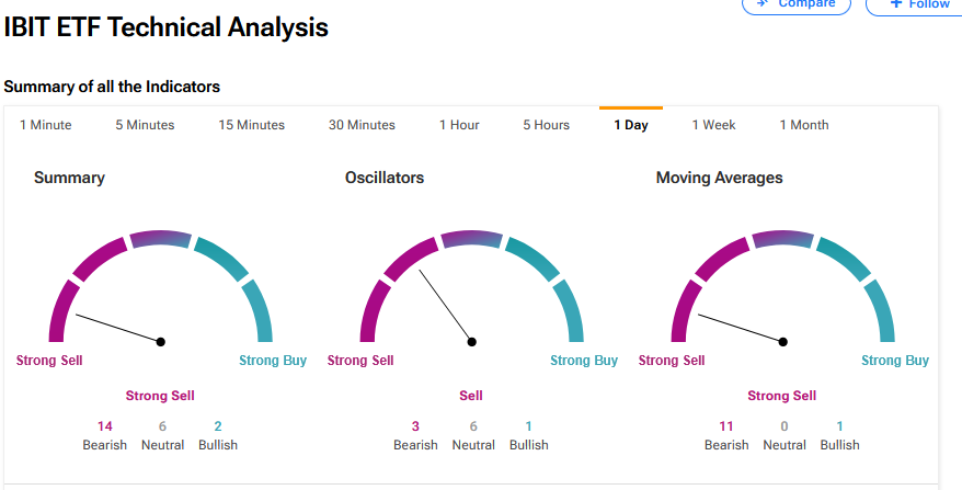According to IBIT’s technical analysis, it has a Strong Sell consensus based on 14 Bearish, 6 Neutral and 2 Bullish ratings.