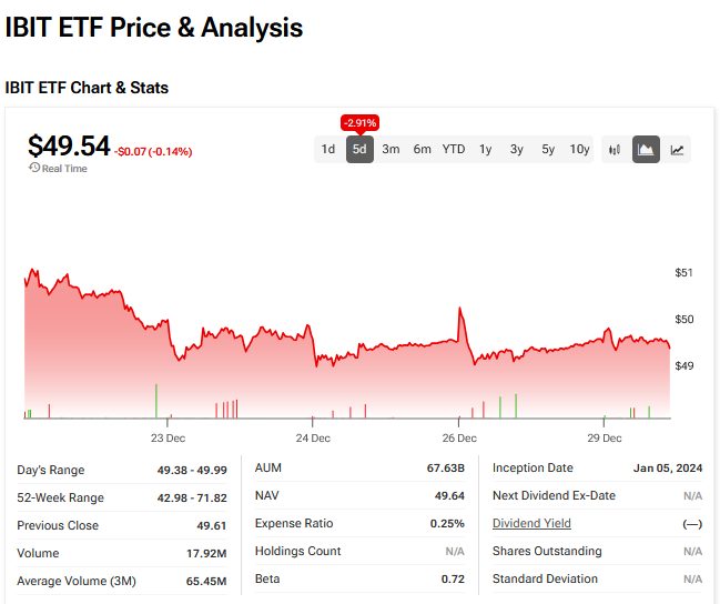The iShares Bitcoin ETF (IBIT) started the final week of the year in less than party mood. It is now down 2.91% over the last 5 days and off 6.48% in the year-to-date.