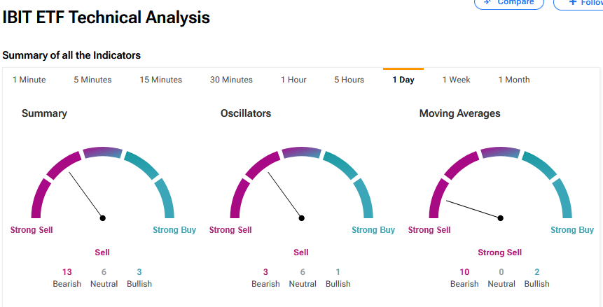 According to the IBIT’s technical analysis, it has a Sell consensus based on 13 Bearish, 6 Neutral and 3 Bullish ratings.