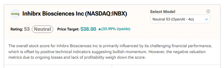 Turning to Wall Street, analyst coverage of Inhibrx Biosciences is limited. Fortunately, TipRanks’ AI analyst has reviewed the stock. The AI analyst rates INBX Neutral (53) with a $38 price target, suggesting about 34% upside.
