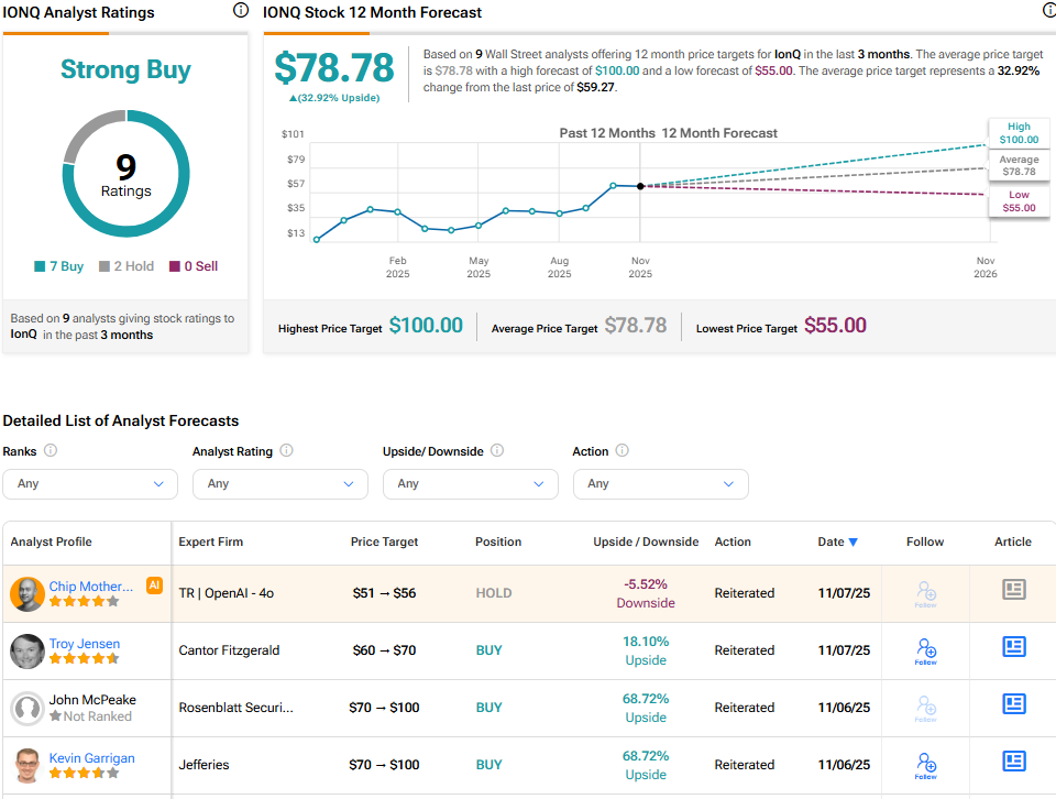On the Street, IonQ holds a Strong Buy consensus rating. The average IONQ stock price target stands at $78.78, implying a 32.92% upside from the current price.