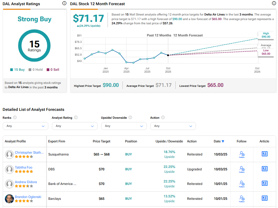 Analysts remain bullish about Delta Air Lines’ stock trajectory. With 15 unanimous Buy ratings, DAL stock commands a Strong Buy consensus rating on TipRanks. Also, the average DAL price target of $71.17 implies 24.29% upside potential from current levels.