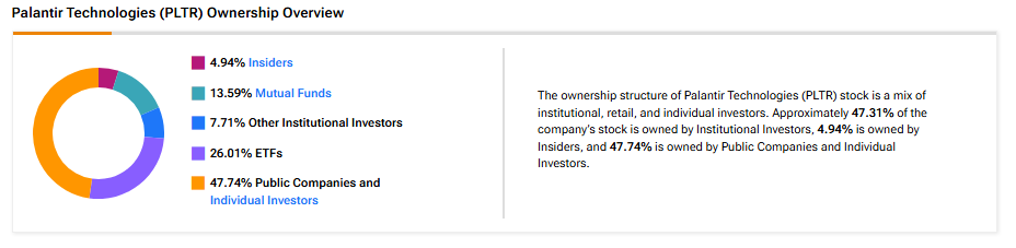Now, according to TipRanks’ ownership page, public companies and individual investors own 47.74% of PLTR. They are followed by ETFs, mutual funds, other institutional investors, and insiders, at 26.10%, 13.59%, 7.71%, and 4.94%, respectively.