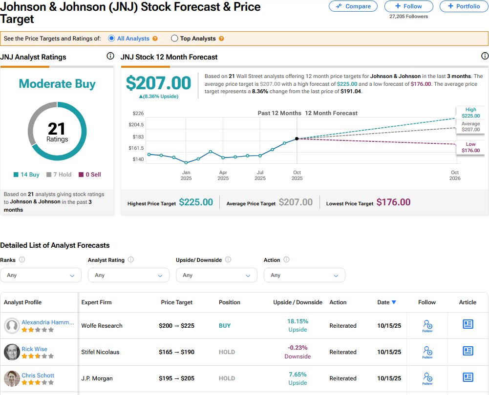 On TipRanks, JNJ has a Moderate Buy consensus based on 14 Buy and 7 Hold ratings. Its highest price target is $225. JNJ stock’s consensus price target is $207, implying an 8.36% upside.