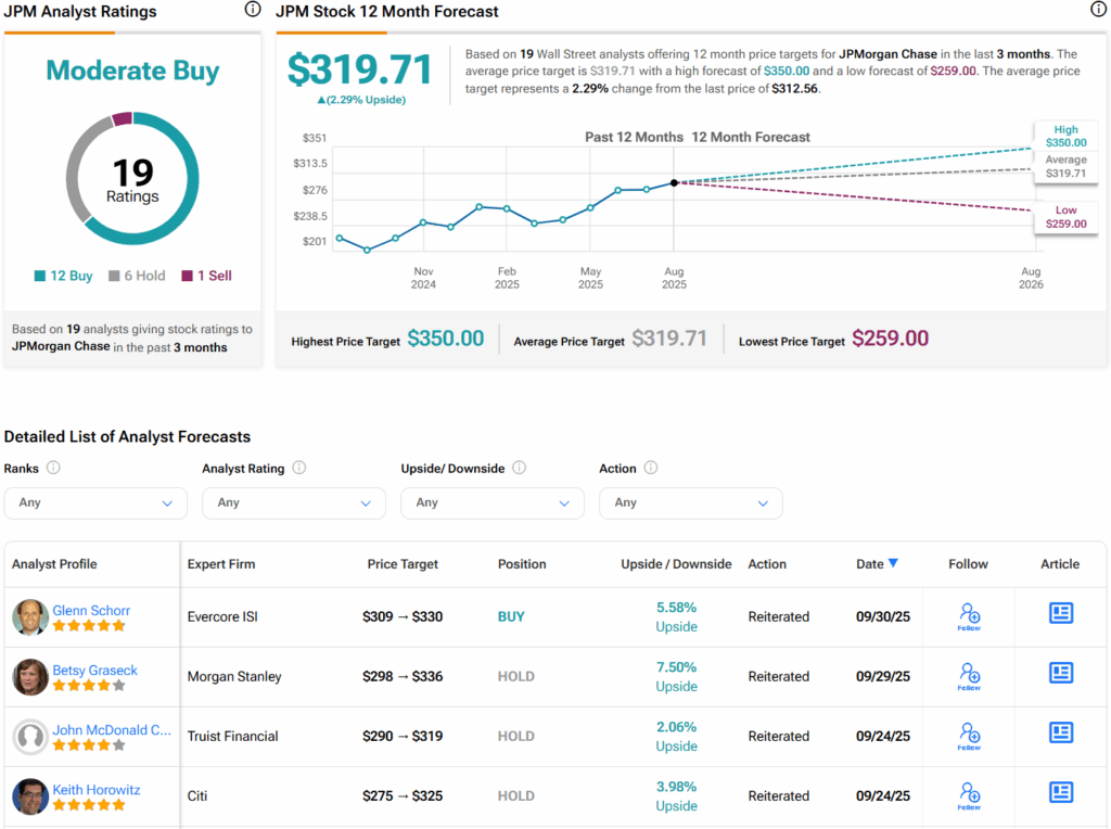 Turning to Wall Street, analysts have a Moderate Buy consensus rating on JPM stock based on 12 Buys, six Holds, and one Sell assigned in the past three months, as indicated by the graphic below. Furthermore, the average JPM price target of $319.71 per share implies 2.3% upside potential.