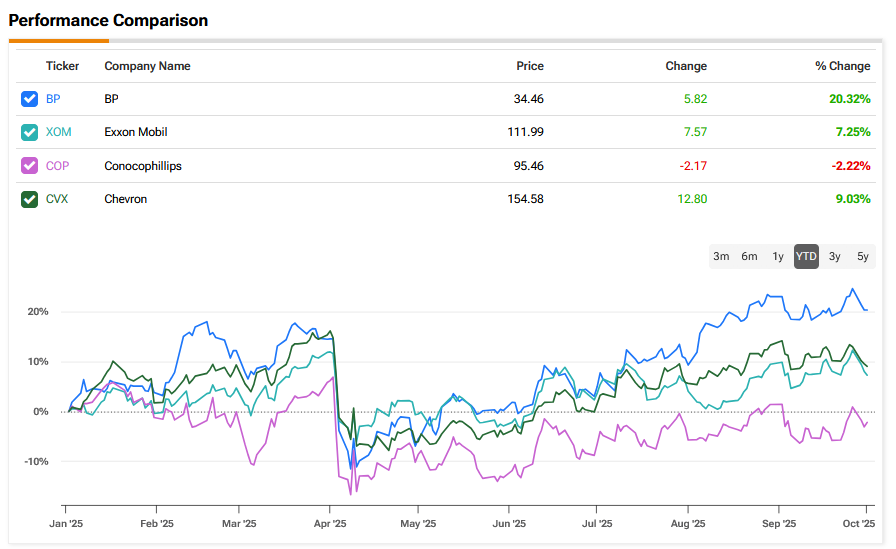 Accordingly, share prices in the sector have struggled over the last 12 months. Exxon Mobil has eked out a 7% gain, with Chevron up 10% and ConocoPhillips down 2%. BP, which shifted focus from renewable energy back to fossil fuels this year, has climbed 21% but even that pales in comparison with other stock sector rallies this year.