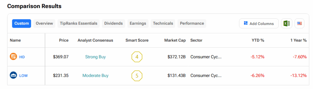 Using TipRanks’ Stock Comparison Tool, we found that Home Depot carries a Strong Buy consensus rating, while Lowe’s holds a Moderate Buy rating from Wall Street analysts.