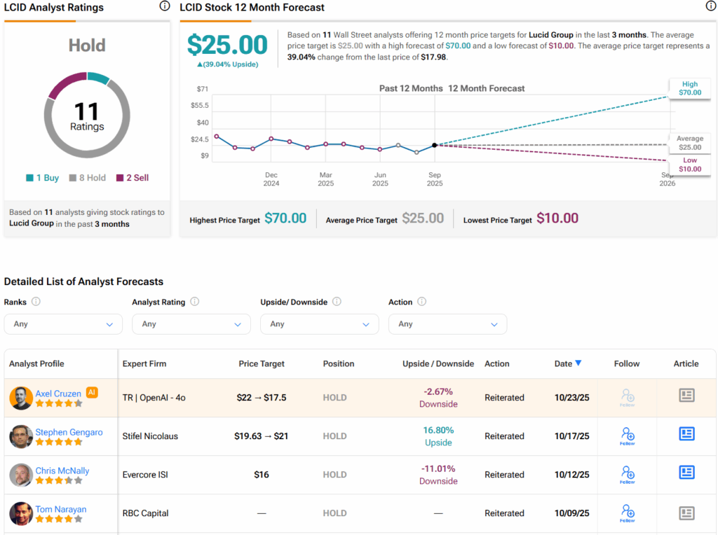 Turning to Wall Street, analysts have a Hold consensus rating on Lucid stock based on one Buy, eight Holds, and two Sells assigned in the past three months, as indicated by the graphic below. Furthermore, the average Lucid price target of $25 per share implies 39% upside potential.