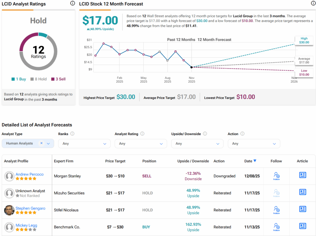 Turning to Wall Street, analysts have a Hold consensus rating on Lucid stock based on one Buy, eight Holds, and three Sells assigned in the past three months, as indicated by the graphic below. Furthermore, the average Lucid price target of $17 per share implies 49% upside potential.