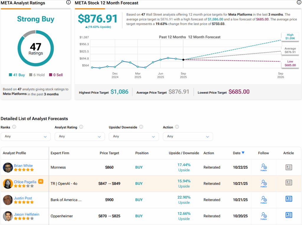 Turning to Wall Street, analysts have a Strong Buy consensus rating on META stock based on 41 Buys, six Holds, and zero Sells assigned in the past three months, as indicated by the graphic below. Furthermore, the average META price target of $876.91 per share implies 19.6% upside potential.