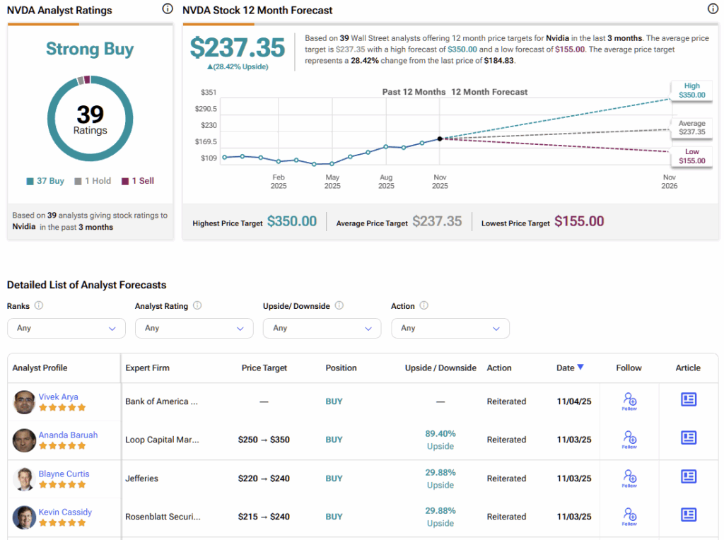 Wall Street analysts, as usual, are lining up strongly behind Nvidia, while taking a far more measured stance on Palantir. Nvidia’s coverage is almost unanimous on Wall Street: 37 Buys, one Hold, and not a single Sell rating. The consensus is a Strong Buy, with an average price target of $237.35, implying ~28% upside over the next 12 months.