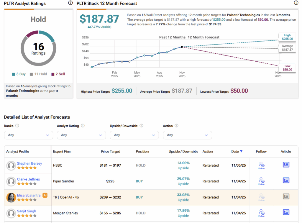 In contrast, Palantir occupies a murkier middle ground for analysts. The defense-sector tech juggernaut has acquired two Buys, eleven Holds, and one Sell, translating to a consensus Hold rating and an average target of $187.87, implying ~8% in potential upside over the next twelve months.
