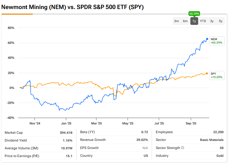 Among the heavyweights in MSCI’s gold miners index, Newmont Mining (NEM) – see below – and Agnico Eagle Mines (AEM) have seen their New York-listed stocks more than double in 2025. Zijin Mining Group Co.’s shares have jumped more than 130% in Hong Kong, outpacing gains in China’s AI darling Alibaba Group Holding (BABA).